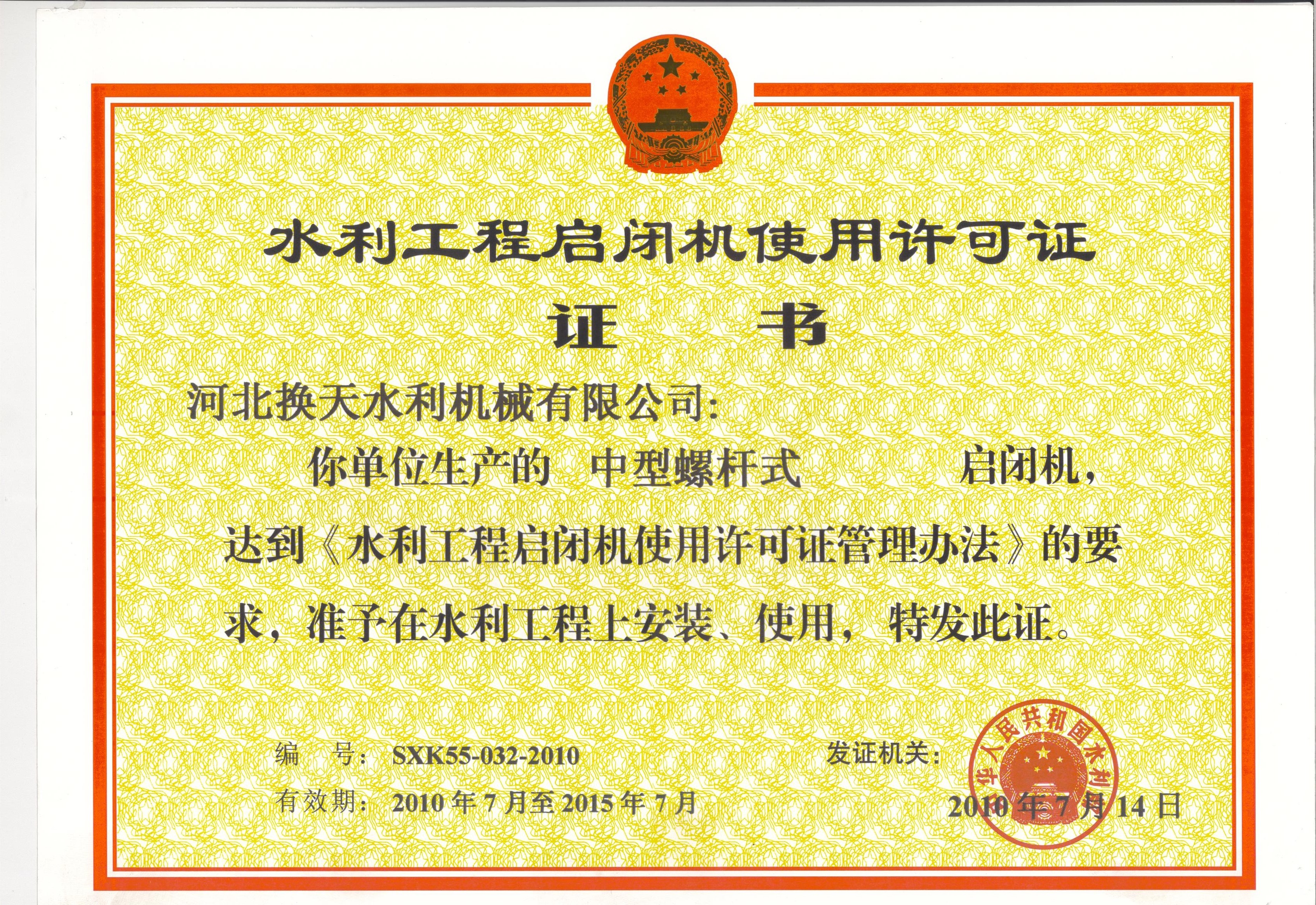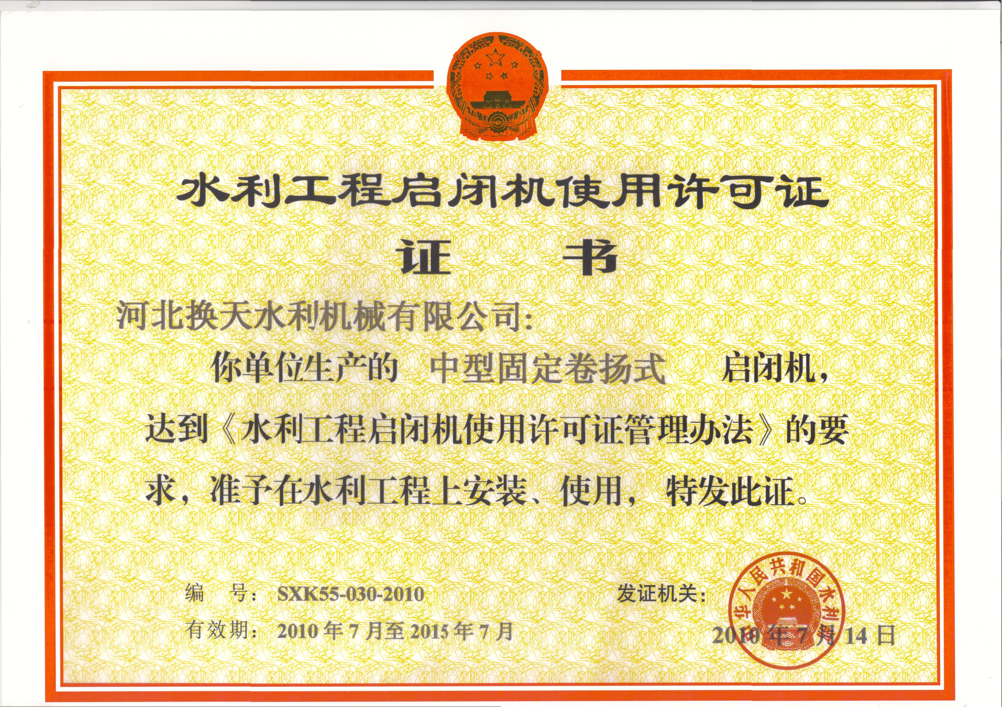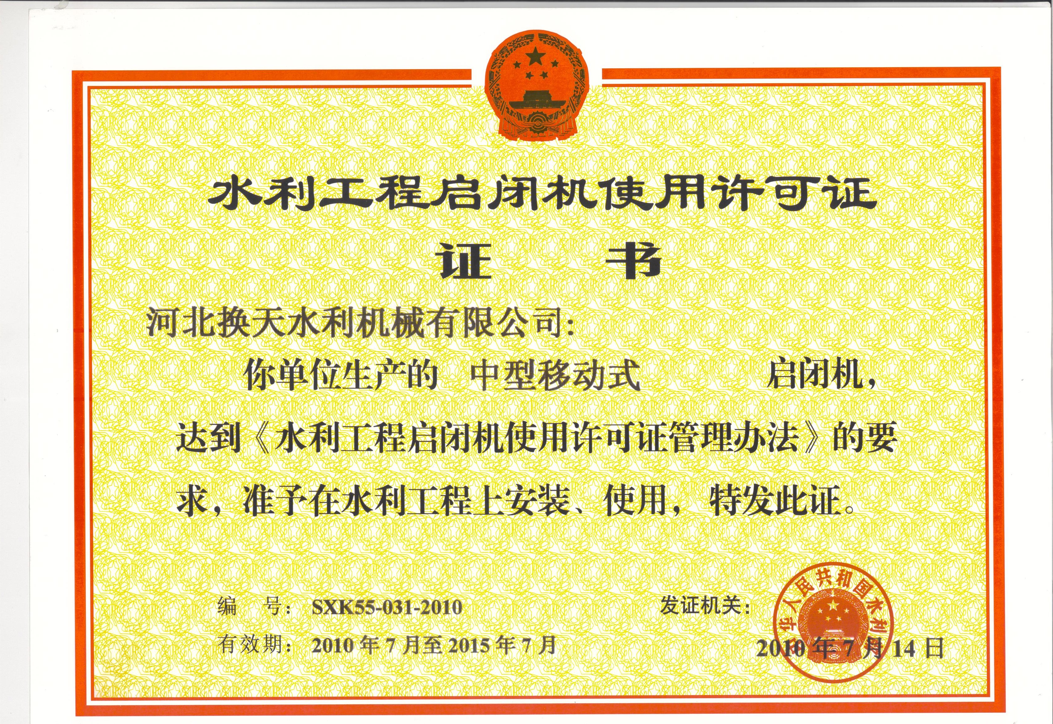 水利工程啟閉機(jī)使用許可證